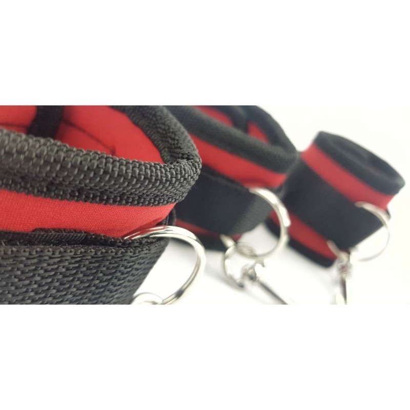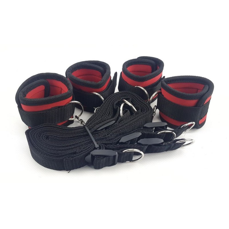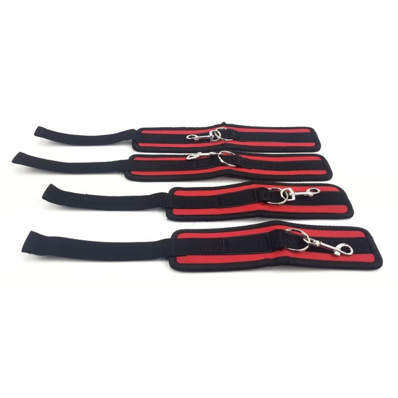♥ 4 menottes ♥ 2 menottes pour les chevilles ♥ 2 menottes pour les poignets ♥ 4 bandes de contrainte ♥ S’adapte à tout type de matelas (même épais sur lit King Size) ♥ Installation facile, sangles ajustables ♥ Réglable pour un meilleur maintien ♥ Coloris noir et rouge