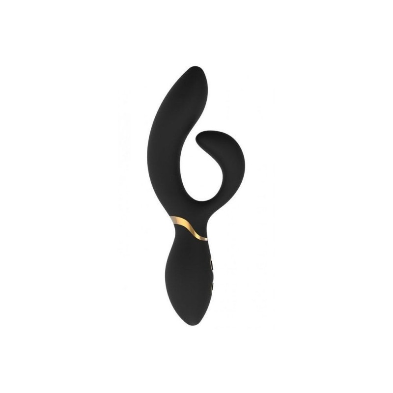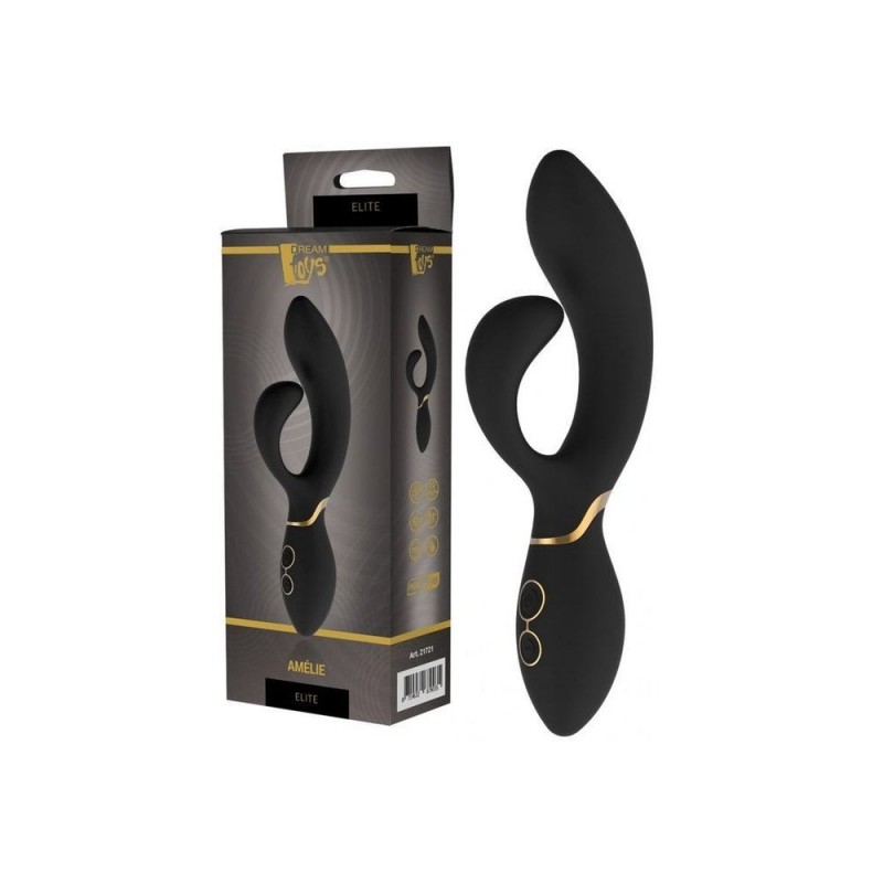 Le vibromasseur Amélie de la collection Elite de Dream Toys est un vibromasseur duo noir avec des accents élégants de couleur or et une tête plutôt grosse et flexible.